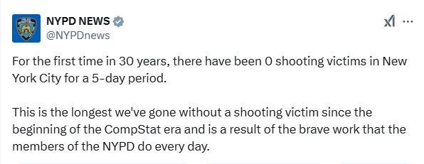 紐約警察局稱,這是警方自1990年代開始使用電腦統(tǒng)計各類案件以來,當?shù)亍俺掷m(xù)無槍擊受傷”最久的一次,是“紐約警方每天勇敢工作的成果”。
