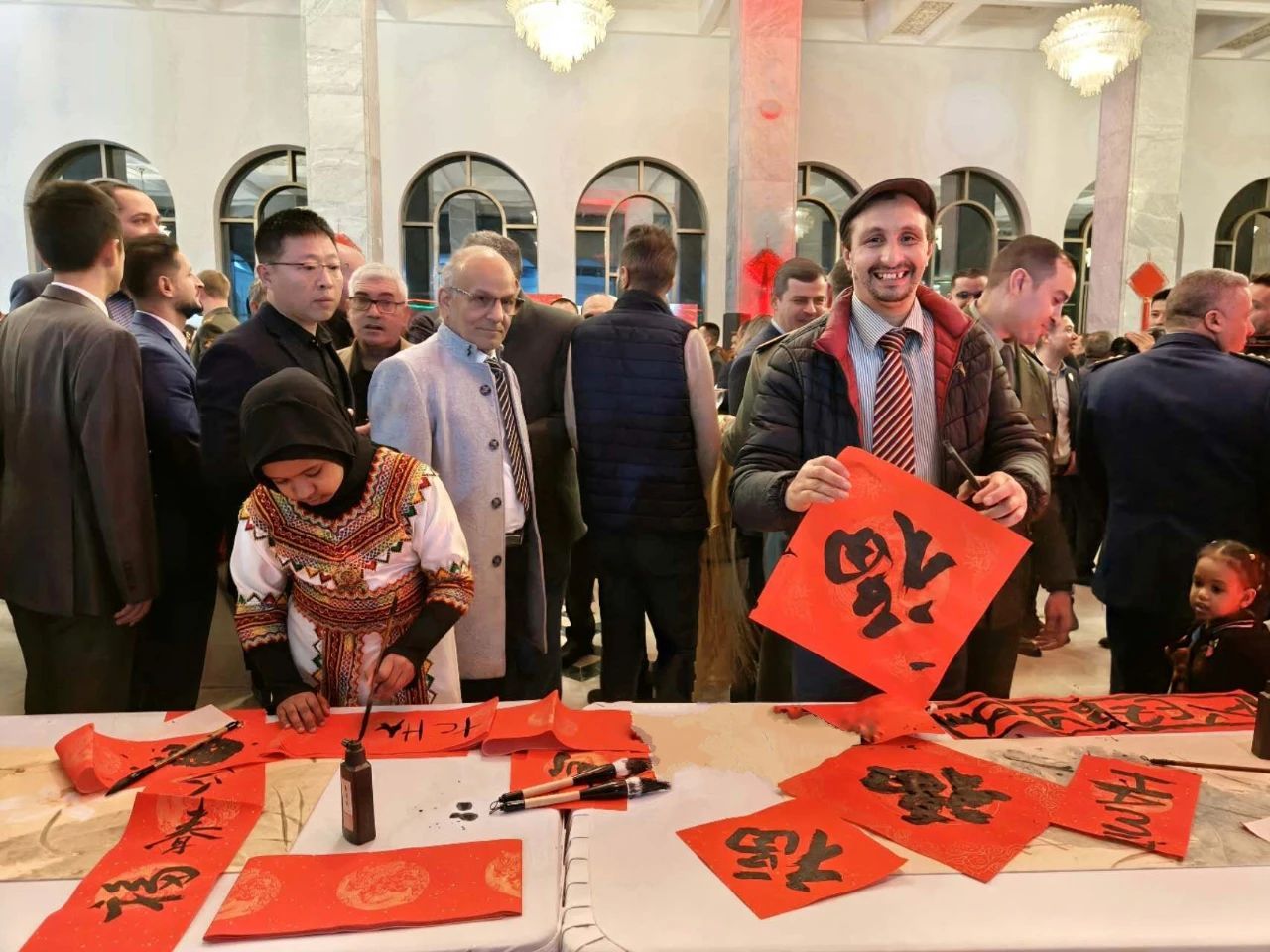 招待會(huì)現(xiàn)場張燈結(jié)彩,中國春節(jié)習(xí)俗及成功申遺宣傳片滾動(dòng)播放,處處洋溢著喜慶祥和的節(jié)日氣氛。來賓們歡迎董廣利大使履新,互致新春問候,暢敘中阿友誼。現(xiàn)場設(shè)立的中國書法、茶藝和拉面展臺(tái)深深吸引著嘉賓們駐足體驗(yàn)。
