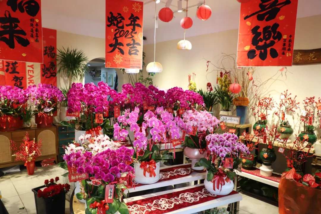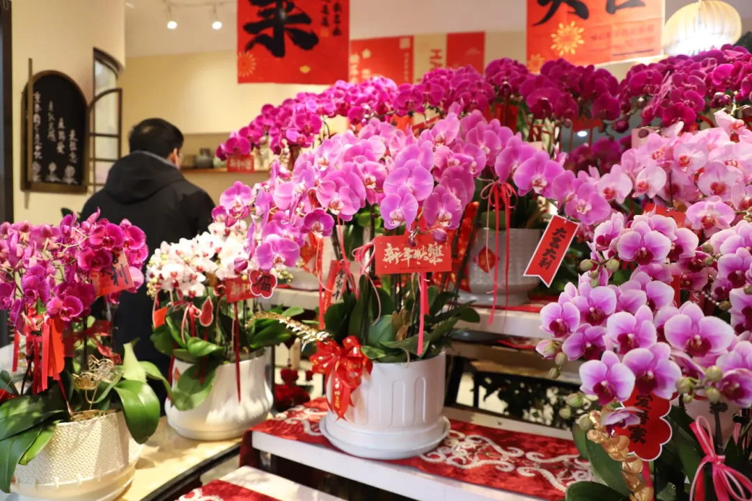 走進老孝感巷尾的一家花店,一排排姹紫嫣紅的蝴蝶蘭占據(jù)著小店“C位”,周圍掛著的新年橫幅把小店裝扮得格外喜慶。