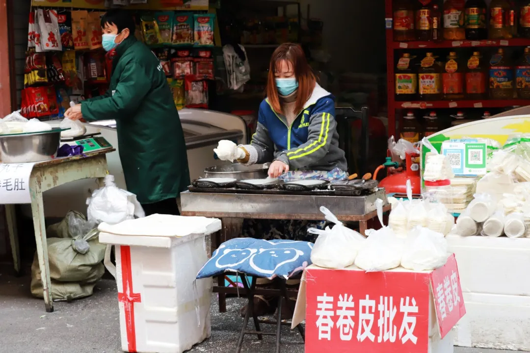 俗話說:“民以食為天”,而那些地地道道的美食就藏在深街小巷,穿梭在老街的農貿市場里,熙熙攘攘的人群中,吆喝聲、討價還價聲、手機付款聲此起彼伏。放眼望去,有一家豎著春卷皮批發(fā)招牌的小店門口排起了長隊,店老板夏女士說:“春卷皮吃法簡單方便,一年四季都很受孝感人青睞,現(xiàn)在臨近春節(jié),來買春卷皮的人特別多,每天能銷幾千張?!?/p>