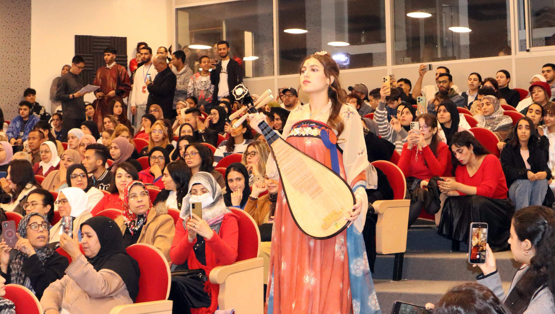 音樂節(jié)目中,孔院合唱團帶來的《仰望星空》和《年少的你啊》通過溫暖的旋律和真摯的歌聲,唱出了青春的活力和對未來的希望??自簶菲魃绫硌莸摹兜秧嵐~音》將古箏與笛子優(yōu)美合奏,為現(xiàn)場觀眾呈現(xiàn)了一場中國傳統(tǒng)音樂的聽覺盛宴。值得一提的是,孔院師生演唱的摩洛哥歌曲《dirou niyya》,將中國春節(jié)的喜慶與摩洛哥音樂完美結(jié)合,瞬間點燃了現(xiàn)場觀眾的熱情。