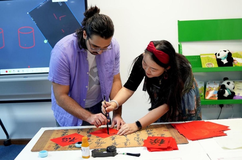 中沙小朋友合唱《我和我的祖國》,學(xué)習(xí)中文的阿布都熱哈曼、沙達(dá)德等與同學(xué)們合唱“新年你好”,小朋友緊張有序地通過三階魔方拼出了新年“燈籠”……活動上還有中阿文歌曲表演、包餃子以及寫福字、剪紙、趣味游戲等豐富多彩的體驗環(huán)節(jié),并特別設(shè)計了春節(jié)知識問答環(huán)節(jié),例如“放煙花的意義是什么?”“春節(jié)有哪些傳統(tǒng)服飾和習(xí)俗?”等問題,大家爭先恐后地?fù)尨?,有的回答精?zhǔn)到位,有的富有創(chuàng)意,有的趕緊借助手機(jī)查閱答案。這些知識點既是老師在課堂上穿插講解的內(nèi)容,也有學(xué)生通過課外自主學(xué)習(xí)獲取的,充分展現(xiàn)了他們對中國文化的濃厚興趣。