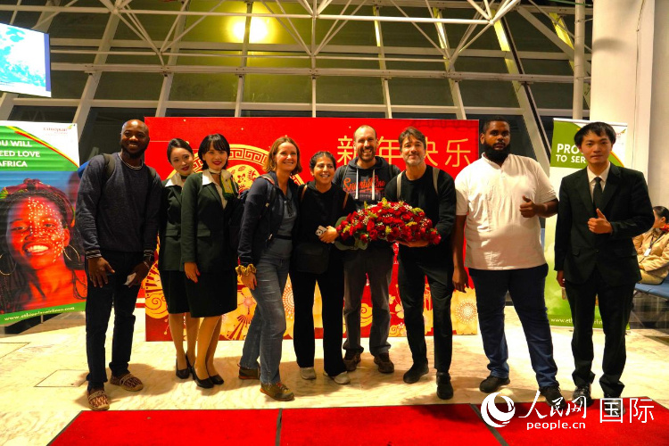 在埃塞航空春節(jié)慶?;顒?dòng)現(xiàn)場,旅客們與埃塞航空中國籍員工合影留念。人民網(wǎng)記者 黃煒鑫攝