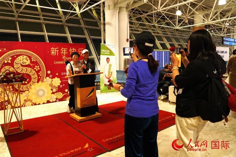 在埃塞航空春節(jié)慶祝活動(dòng)現(xiàn)場,即將回國的一對中國夫婦在合影留念。人民網(wǎng)記者 黃煒鑫攝