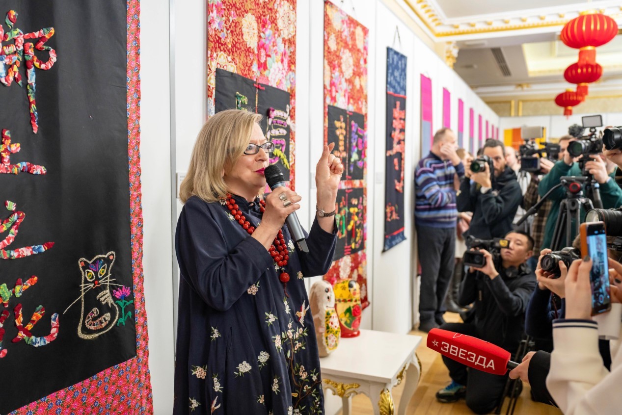 伊琳娜·扎哈羅娃是藝術(shù)學(xué)博士、俄羅斯普希金造型藝術(shù)博物館高級(jí)研究員。她隨丈夫扎哈羅夫在中國(guó)生活期間深入鉆研中國(guó)民間藝術(shù),她的作品將中國(guó)書法與織物刺繡巧妙結(jié)合。開幕式上,她向現(xiàn)場(chǎng)觀眾講述了多幅作品的創(chuàng)作過程和文化含義,表示每一幅作品都傾注了她對(duì)中國(guó)文化的熱愛。