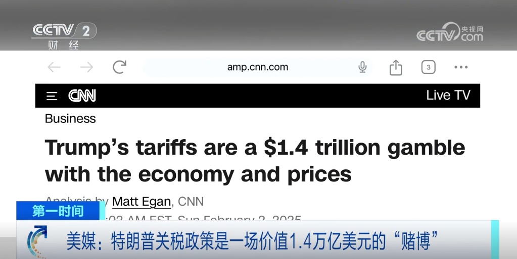 美國(guó)有線電視新聞網(wǎng)的報(bào)道稱,關(guān)稅是特朗普最喜歡的“經(jīng)濟(jì)武器”。特朗普2月1日簽署行政令,宣布對(duì)約1.4萬(wàn)億美元的進(jìn)口商品加征關(guān)稅,是特朗普第一任期內(nèi)加征關(guān)稅商品價(jià)值的三倍多。報(bào)道指出,“這是一場(chǎng)巨大的賭博”,事關(guān)美國(guó)選民最關(guān)心的兩件事:經(jīng)濟(jì)與生活成本。報(bào)道稱,分析人士指出,特朗普的新關(guān)稅政策將可能帶來(lái)巨大風(fēng)險(xiǎn),比如導(dǎo)致經(jīng)濟(jì)放緩、通脹加劇,引發(fā)股市波動(dòng),以及在“貿(mào)易戰(zhàn)”中扼殺就業(yè)機(jī)會(huì)等。美國(guó)《華爾街日?qǐng)?bào)》發(fā)表了一篇名為《史上最愚蠢的貿(mào)易戰(zhàn)》的評(píng)論文章,認(rèn)為特朗普對(duì)加拿大和墨西哥進(jìn)行“經(jīng)濟(jì)攻擊毫無(wú)道理”,并警告稱這一戰(zhàn)略可能會(huì)以災(zāi)難告終。
