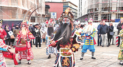 來(lái)自廣東汕頭潮陽(yáng)的西門(mén)英歌隊(duì)一出場(chǎng)就將現(xiàn)場(chǎng)氣氛推向高潮。演員們雙手各持一根短木棒,配合節(jié)奏,上下左右對(duì)擊。傳統(tǒng)臉譜色彩鮮明,表演服飾華麗亮眼,“男女英歌斗舞”令人目不暇接,整體呈現(xiàn)出強(qiáng)烈的力量感和蓬勃朝氣。一位德國(guó)觀眾對(duì)記者表示:“這是我第一次看到中國(guó)的春節(jié)民俗表演,它有著和德國(guó)節(jié)日類(lèi)似的巡游形式,但卻有自身的特色,非常有趣?!?/p>