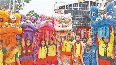 巴西當(dāng)?shù)厍嗄杲M成的舞獅隊(duì)。人民日?qǐng)?bào)記者 時(shí)元皓攝