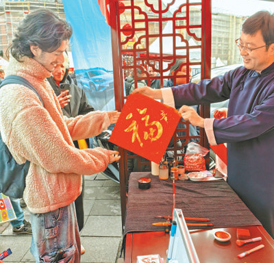 活動(dòng)現(xiàn)場(chǎng)的非遺手工藝品和美食區(qū)也吸引了大量當(dāng)?shù)孛癖妳⑴c,傳統(tǒng)手工藝糖畫(huà)、毛筆書(shū)法體驗(yàn)展位前更是排起了長(zhǎng)龍。當(dāng)?shù)孛癖娨翣柕掀澟抨?duì)很久終于如愿領(lǐng)取禮品,他饒有興致地觀看現(xiàn)場(chǎng)工作人員寫(xiě)下金色的“?!弊?,還特別要求加上他姓氏的中文譯名。“這是我第一次逛春節(jié)廟會(huì),這里熱鬧紅火,還有美食和禮品,向所有人開(kāi)放,非常新奇,富有創(chuàng)意。如果有機(jī)會(huì),我希望親自去中國(guó)走走看看!”伊爾迪茲說(shuō)。