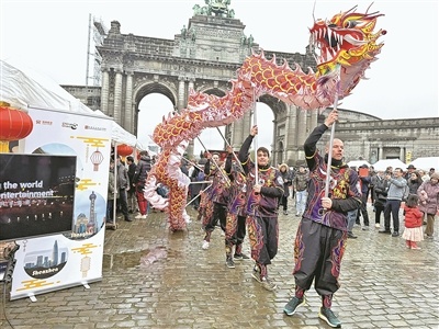 比利時(shí)“中國(guó)春節(jié)游園廟會(huì)”上,舞龍隊(duì)正在表演。人民日?qǐng)?bào)記者 牛瑞飛攝