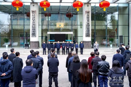“期待你們凱旋而歸,出征!”授旗儀式上,黃石經(jīng)濟(jì)技術(shù)開發(fā)區(qū)黨工委書記、管委會主任、鐵山區(qū)委書記萬鼎為大灣區(qū)招商分局、三角招商分局、武漢招商分局、鐵山街道招商專班授旗,4名招商專班負(fù)責(zé)人鄭重接過旗幟。