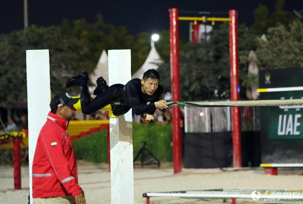 中國(guó)特警隊(duì)員在比賽中翻越障礙。人民網(wǎng)記者 任皓宇攝