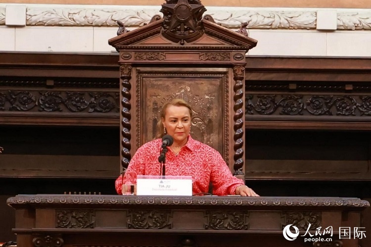 里約州議會(huì)副議長、巴中議員陣線主席蒂婭·茹在活動(dòng)中致辭。人民網(wǎng)記者 陳海琪攝
