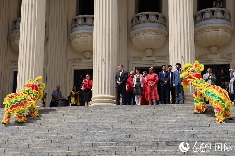 人民網(wǎng)里約熱內(nèi)盧2月6日電 (記者陳一鳴、陳海琪)鑼鼓喧天,雄獅登場。當(dāng)?shù)貢r(shí)間2月6日下午,在巴西里約熱內(nèi)盧蒂拉登特斯宮(州議會(huì))門廊前,里約州議會(huì)副議長、巴中議員陣線主席蒂婭·茹和中國駐里約熱內(nèi)盧總領(lǐng)事田敏用手中的毛筆共同為兩只“獅子”點(diǎn)睛。伴隨著鏗鏘的鼓點(diǎn),“獅子”舞動(dòng)起來,這場精彩的舞獅表演為里約州議會(huì)中國春節(jié)慶祝活動(dòng)拉開序幕。來自中巴兩國政界、學(xué)界、企業(yè)界和文化界的近200名嘉賓歡聚一堂,共同慶祝中國農(nóng)歷乙巳蛇年新春的到來。