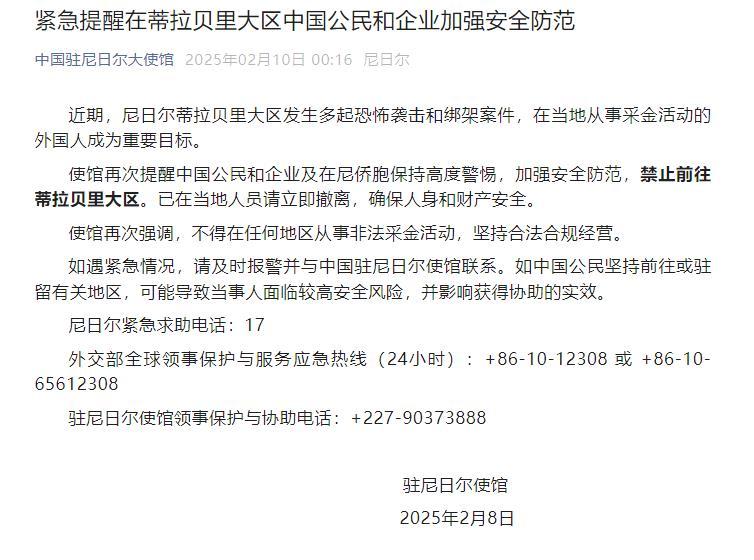 央視網(wǎng)消息:據(jù)“中國駐尼日爾大使館”微信公眾號消息,中國駐尼日爾大使館發(fā)布公告,緊急提醒在蒂拉貝里大區(qū)中國公民和企業(yè)加強安全防范: