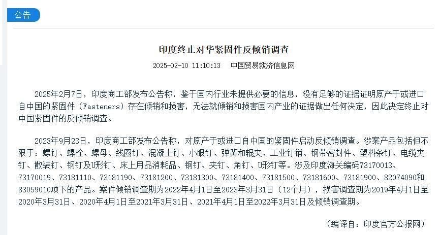 央視網(wǎng)消息:據(jù)中國貿(mào)易救濟信息網(wǎng),2025年2月7日,印度商工部發(fā)布公告稱,鑒于國內(nèi)行業(yè)未提供必要的信息,沒有足夠的證據(jù)證明原產(chǎn)于或進(jìn)口自中國的緊固件(Fasteners)存在傾銷和損害,無法就傾銷和損害國內(nèi)產(chǎn)業(yè)的證據(jù)做出任何決定,因此決定終止對中國緊固件的反傾銷調(diào)查。