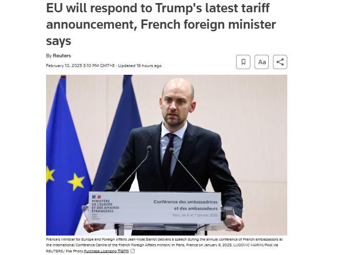 據(jù)路透社報道,當(dāng)?shù)貢r間10日,法國外交部長讓-諾埃爾·巴羅表示,歐盟將就美國對其加征的最新關(guān)稅聲明進(jìn)行反制。
