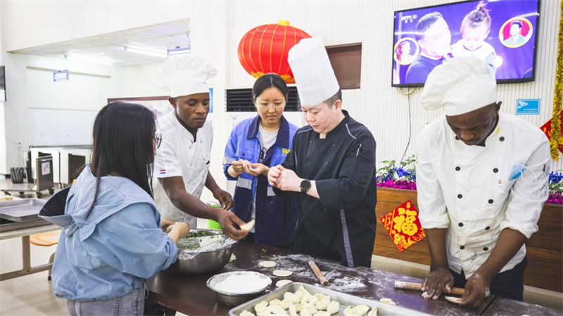 除夕晚上,礦區(qū)食堂后廚熱鬧非凡。中國廚師唐師傅正帶領當地員工包餃子。員工布萊澤剛學搟面皮,一會兒這邊厚了,一會兒那邊又薄了,急得他滿頭是汗,唐師傅拍了拍他的肩膀安慰道:“別著急,慢慢來,多試幾次就好了?!睅捉浥?,本地員工們逐漸找到了“感覺”,餃子產出速度大大提升,唐師傅也豎起大拇指夸贊。布萊澤用不太流利的中文和法語夾雜著說:“中國餃子象征團圓和豐收,是對美好生活的向往和期待!今后我也要包給家人吃!”
