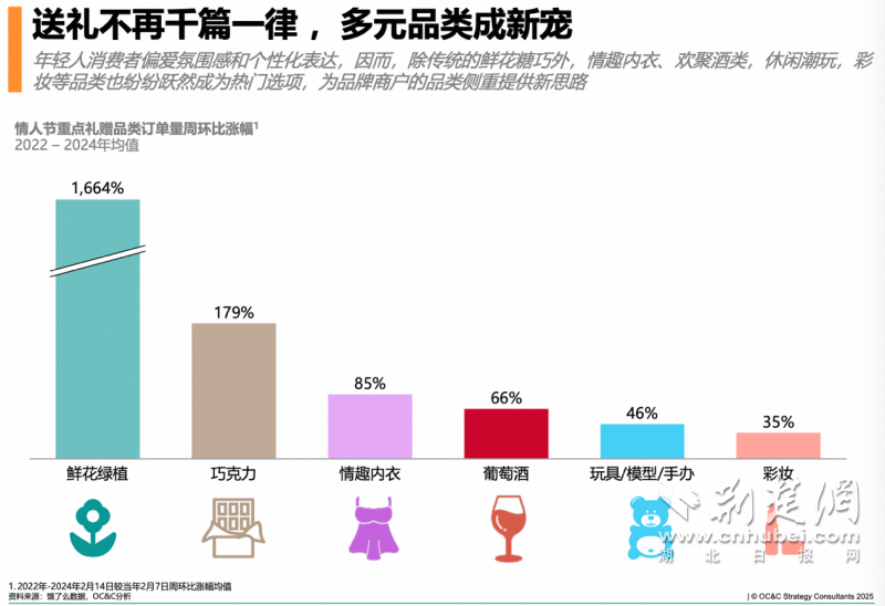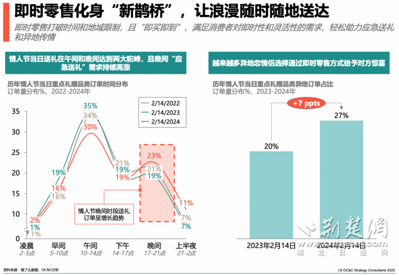 荊楚網(wǎng)(湖北日報網(wǎng))訊(通訊員 易曄)元宵才過,情人節(jié)接檔。零售品牌商戶們毫不猶豫步入下一個生意高峰,過節(jié)的愛人們也不慌不忙在節(jié)日當(dāng)天開始籌備浪漫表達(dá)。近日,餓了么聯(lián)合戰(zhàn)略咨詢公司OC&C共同發(fā)布的《情人節(jié)即時零售禮贈趨勢與品類機遇洞察》顯示,過去三年情人節(jié)當(dāng)天,重點禮贈品類的外賣單量較12日環(huán)比增長超過3倍,且當(dāng)日送禮訂單在晚間(17-21點)需求持續(xù)增長。