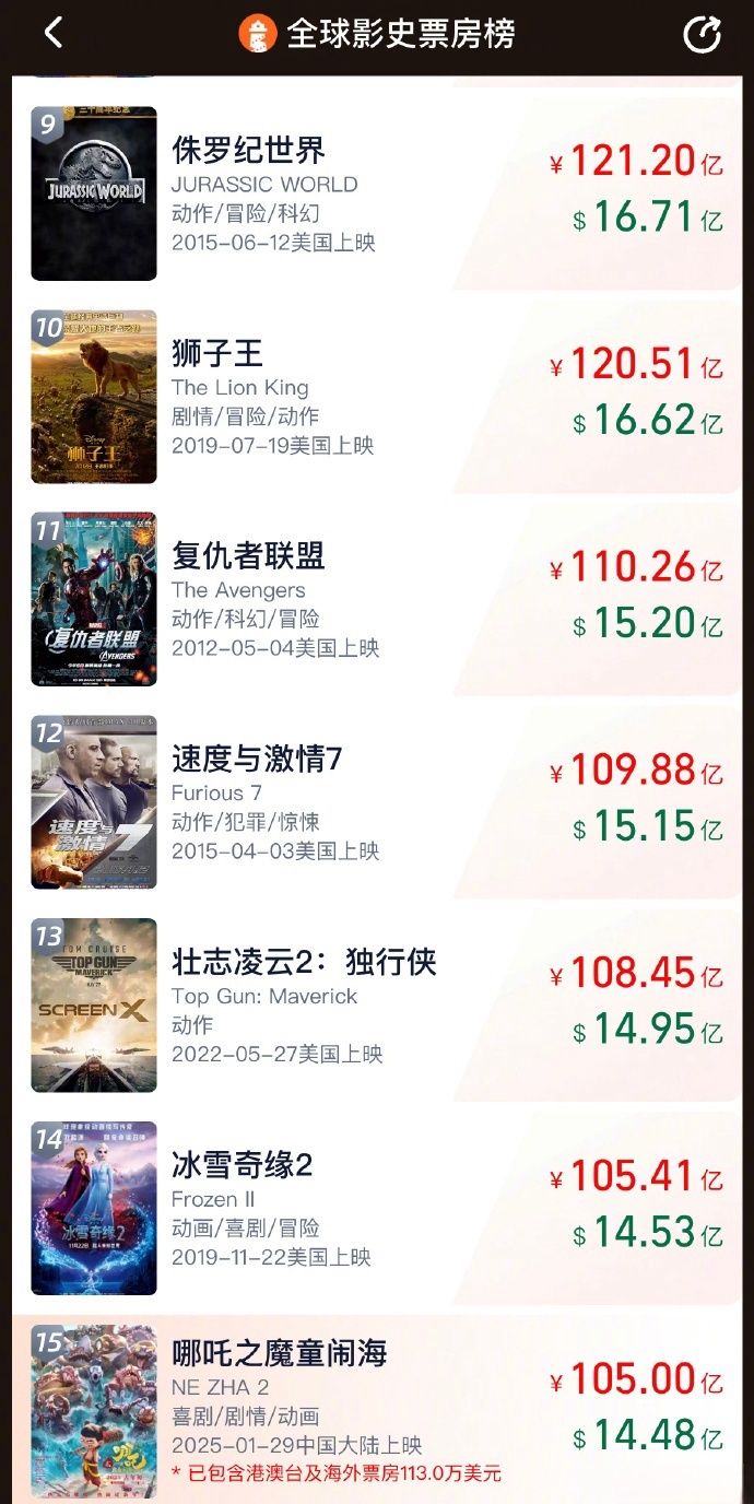 央視網(wǎng)消息:據(jù)統(tǒng)計(jì),《哪吒之魔童鬧?!房偲狈浚êc(diǎn)映及預(yù)售)已超過《芭比》,成功進(jìn)入全球影史票房TOP15。