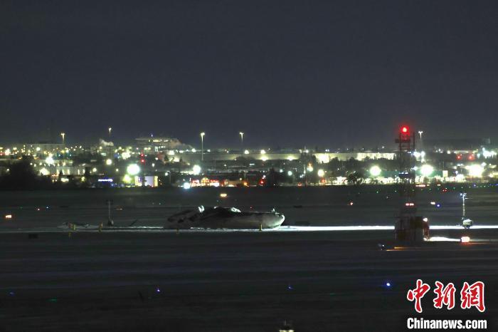 當(dāng)?shù)貢r間2月18日晚間,記者拍攝的在多倫多皮爾遜國際機(jī)場著陸時失事的美國達(dá)美航空客機(jī)殘骸畫面,可見飛機(jī)仍以倒置姿態(tài)停留在積雪的跑道上。機(jī)體有部分分離,機(jī)身損毀嚴(yán)重。中新社記者 余瑞冬 攝