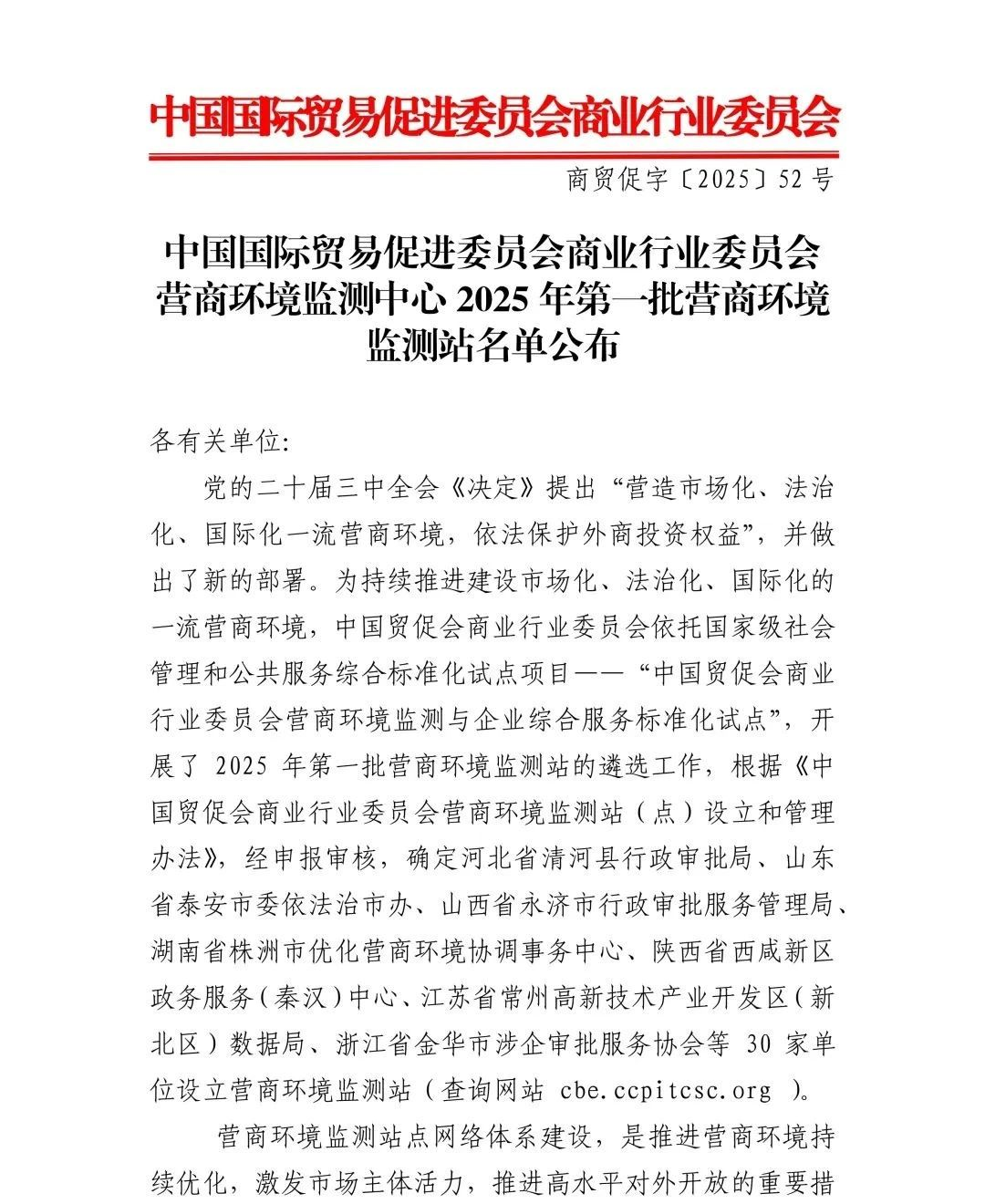 為持續(xù)推進建設(shè)市場化、法治化、國際化的一流營商環(huán)境,中國貿(mào)促會商業(yè)行業(yè)委員會依托國家級社會管理和公共服務(wù)綜合標準化試點項目——“中國貿(mào)促會商業(yè)行業(yè)委員會營商環(huán)境監(jiān)測與企業(yè)綜合服務(wù)標準化試點”,開展了2025年第一批營商環(huán)境監(jiān)測站的遴選工作,根據(jù)《中國貿(mào)促會商業(yè)行業(yè)委員會營商環(huán)境監(jiān)測站(點)設(shè)立和管理辦法》,經(jīng)申報審核,確定湖北省孝感市孝南區(qū)營商環(huán)境促進中心、河北省清河縣行政審批局、江蘇省常州高新技術(shù)產(chǎn)業(yè)開發(fā)區(qū)(新北區(qū))數(shù)據(jù)局、浙江省金華市涉企審批服務(wù)協(xié)會等30家單位設(shè)立營商環(huán)境監(jiān)測站。
