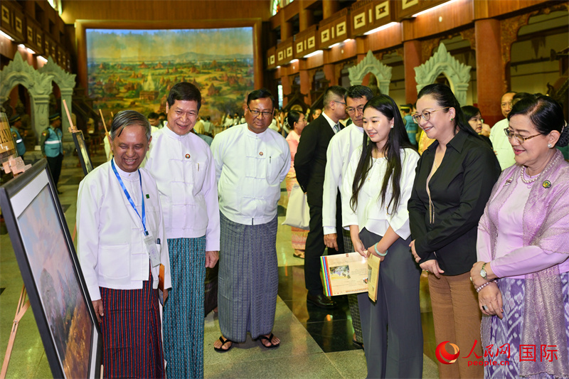 中國駐緬甸大使馬珈同曼德勒省首席部長妙昂、緬宗教事務與文化部副部長努妙姍觀摩”瀾湄文化節(jié)“美術(shù)展。人民網(wǎng)記者 謝佳君攝
