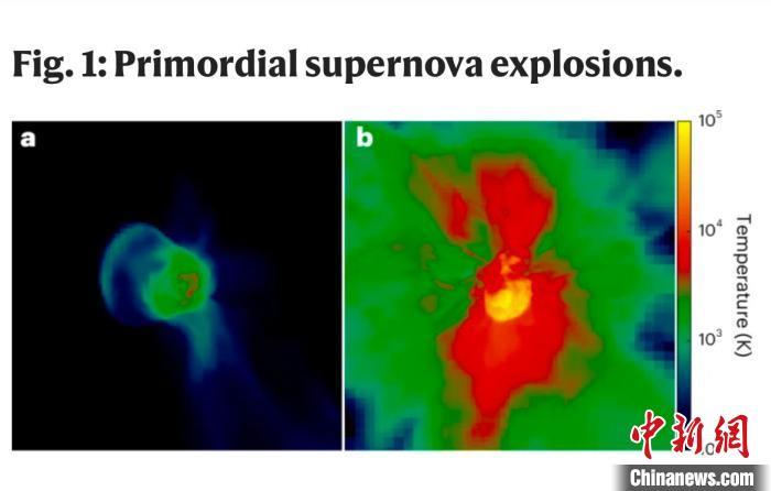 在本項(xiàng)研究中,論文第一作者兼共同通訊作者、英國(guó)樸次茅斯大學(xué)D. J. Whalen和同事及合作者一起,利用分別模擬了13倍、200倍太陽(yáng)質(zhì)量恒星的兩個(gè)超新星計(jì)算機(jī)模型,來(lái)分析這些超新星爆炸的產(chǎn)物。他們發(fā)現(xiàn),由于達(dá)到了極高的溫度和密度,第一個(gè)和第二個(gè)模擬中分別產(chǎn)生了0.051倍和55倍太陽(yáng)質(zhì)量的氧。