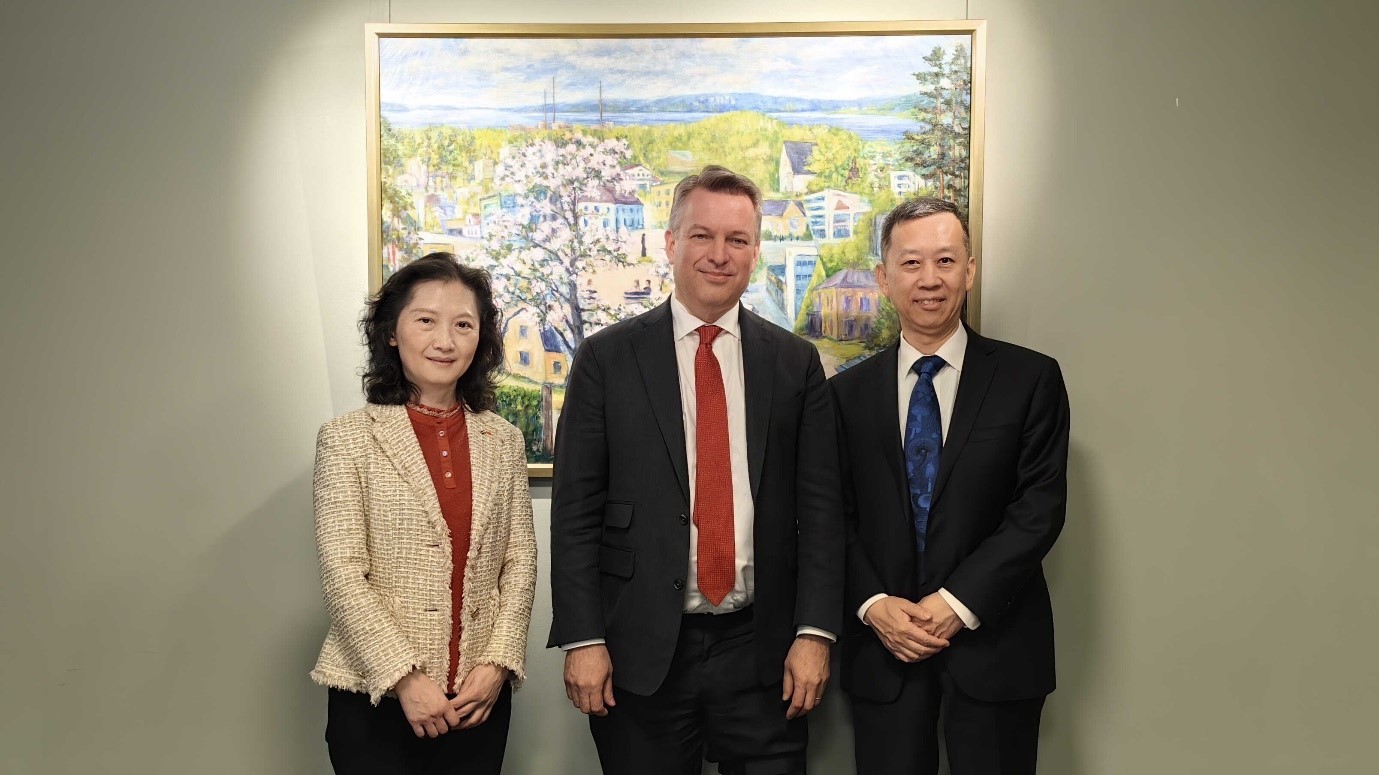 中國駐瑞典大使崔愛民(右)會(huì)見瑞典利丁厄市市長凱倫福斯(中)。 中國駐瑞典大使館供圖