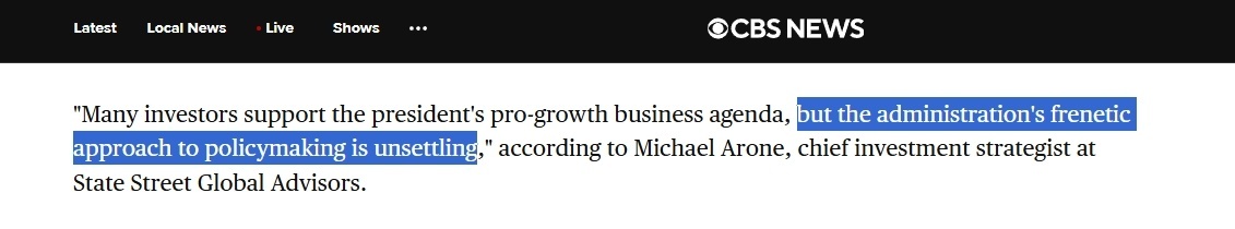 道富環(huán)球投資管理公司首席投資策略師邁克爾·阿羅內(nèi)更是直言,特朗普政府制定經(jīng)濟(jì)政策的方式是“瘋狂的”,“令人不安”。