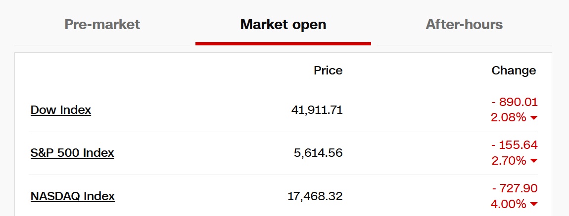 截至10日收盤時,美股三大指數(shù)集體收跌,道指跌2.08%,納指跌4%,標(biāo)普500指數(shù)跌2.7%。