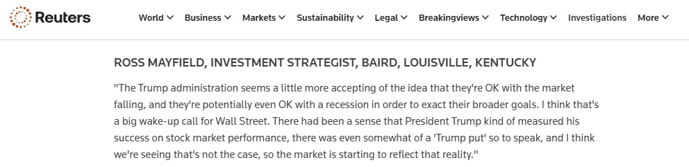 投資分析師羅斯·梅菲爾德表示,特朗普9日的言論似乎表現(xiàn)出其針對當(dāng)前股市下行的趨勢是可以接受的。為了實(shí)現(xiàn)某些特定的執(zhí)政目標(biāo),特朗普政府甚至可能對“經(jīng)濟(jì)衰退”感到滿意,此前華爾街一貫認(rèn)為特朗普政府在股市上需要獲得成功,而這樣的變化為華爾街的投資者敲響了警鐘。