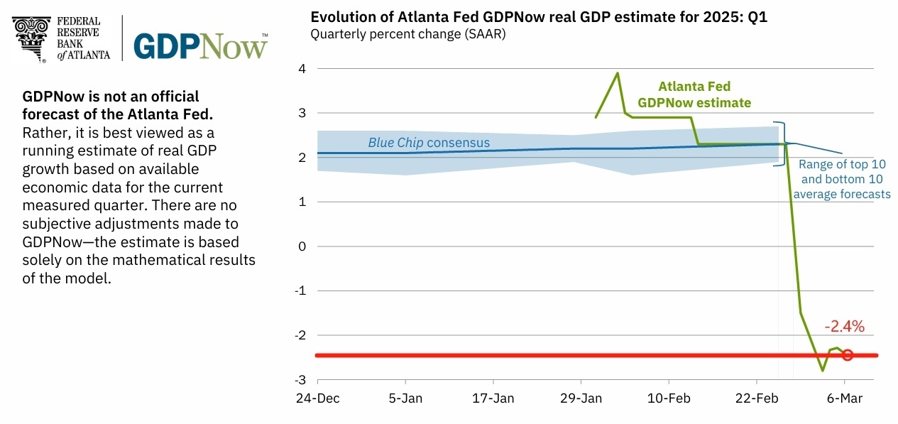 按照廣義的定義,連續(xù)兩個季度經(jīng)濟(jì)負(fù)增長通常被認(rèn)為是經(jīng)濟(jì)衰退的信號,而當(dāng)前美國經(jīng)濟(jì)已經(jīng)顯現(xiàn)出了衰退的跡象。根據(jù)美國亞特蘭大聯(lián)儲的GDPNow模型早在3月6日的預(yù)測——美國2025年第一季度國內(nèi)生產(chǎn)總值將萎縮2.4%。