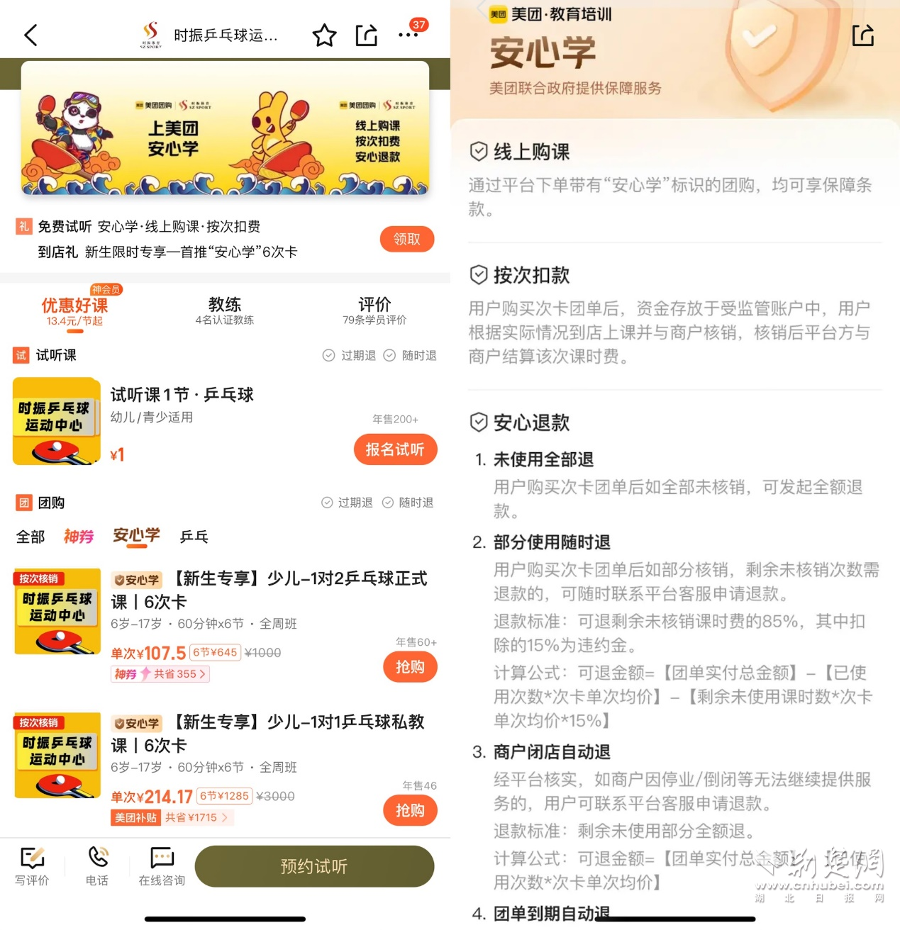 據(jù)了解,“安心學(xué)”是美團聯(lián)合各地政府部門,面向教育培訓(xùn)領(lǐng)域創(chuàng)新推出的履約交易保障新模式,主要依托平臺的多次卡團購產(chǎn)品,在運動培訓(xùn)、書法、科學(xué)探索、棋藝、美術(shù)、國學(xué)、音樂等非學(xué)科類培訓(xùn)品類推出按次扣費的短期課,給消費者提供靈活、可靠的消費保障。