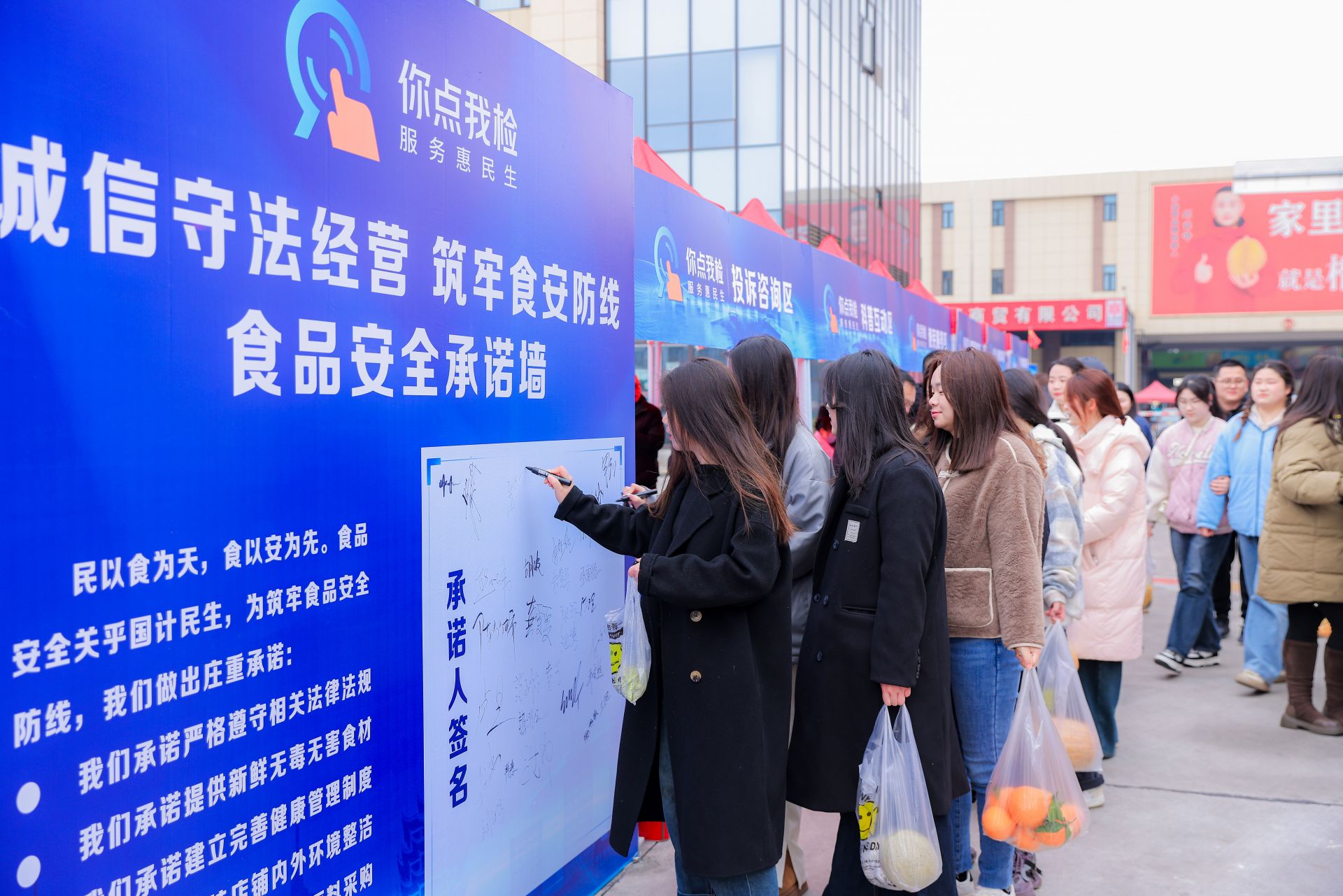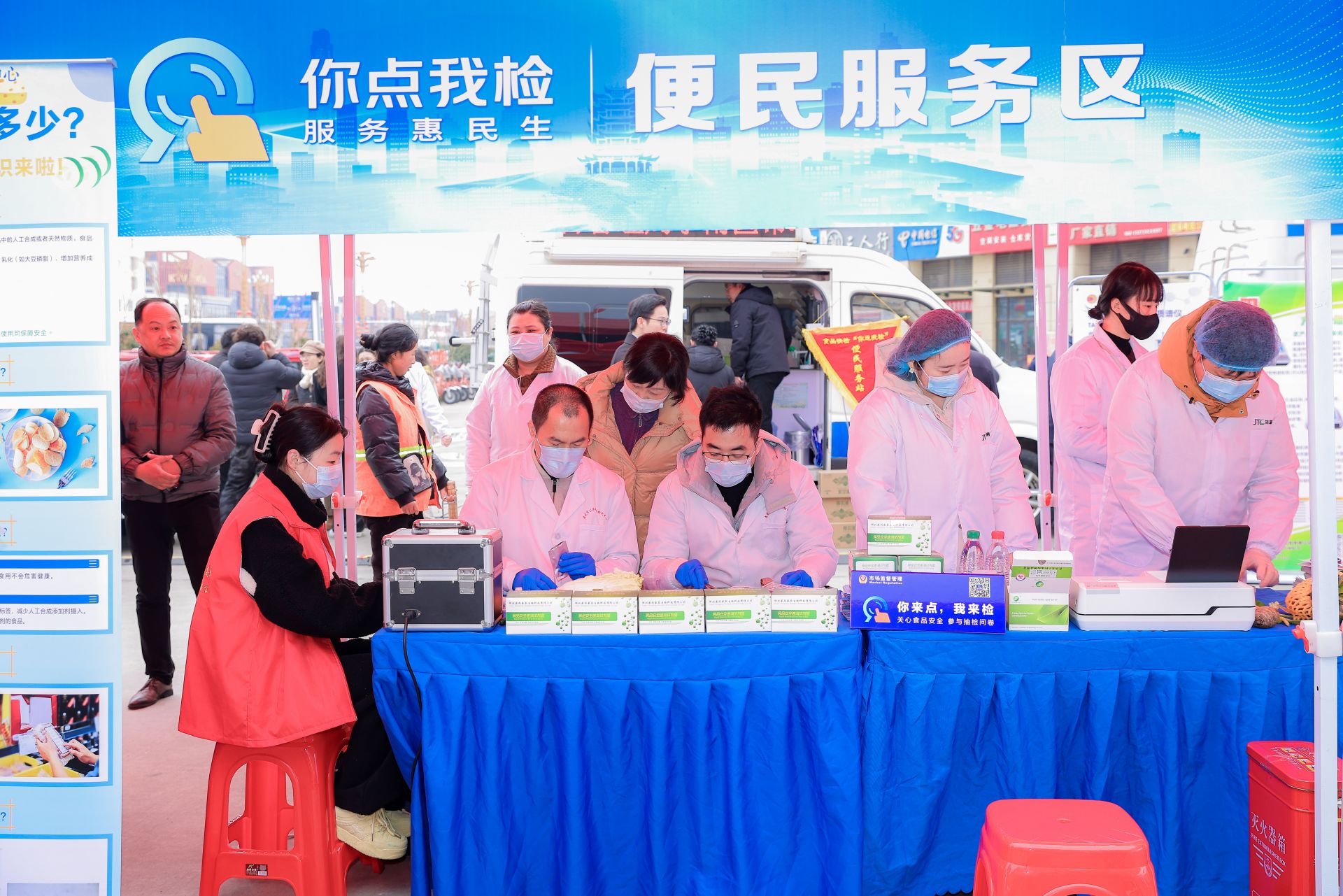 在隨后舉辦的現(xiàn)場(chǎng)活動(dòng)中,工作人員設(shè)置了問(wèn)卷填寫、便民服務(wù)、科普互動(dòng)、投訴咨詢等多個(gè)區(qū)域與群眾積極互動(dòng)。在問(wèn)卷填寫區(qū),引導(dǎo)群眾通過(guò)使用“你點(diǎn)我檢 服務(wù)惠民生”民意征集系統(tǒng),點(diǎn)選想要抽檢的食品品類、場(chǎng)所和項(xiàng)目;在便民服務(wù)區(qū),接受群眾送檢食材,并開(kāi)展現(xiàn)場(chǎng)檢驗(yàn);在科普互動(dòng)區(qū),通過(guò)發(fā)放科普折頁(yè)和開(kāi)展知識(shí)轉(zhuǎn)盤有獎(jiǎng)答題等形式,向群眾宣傳食品安全知識(shí);在投訴咨詢區(qū),向群眾普及消費(fèi)維權(quán)知識(shí),并現(xiàn)場(chǎng)受理投訴舉報(bào),維護(hù)消費(fèi)者合法權(quán)益。除此之外,現(xiàn)場(chǎng)還設(shè)置了“點(diǎn)選征集公示欄”,對(duì)前期群眾點(diǎn)選意見(jiàn)予以公示;設(shè)置了食品安全承諾墻,號(hào)召經(jīng)營(yíng)者通過(guò)簽名形式承諾誠(chéng)信守法,牢記食品安全責(zé)任。