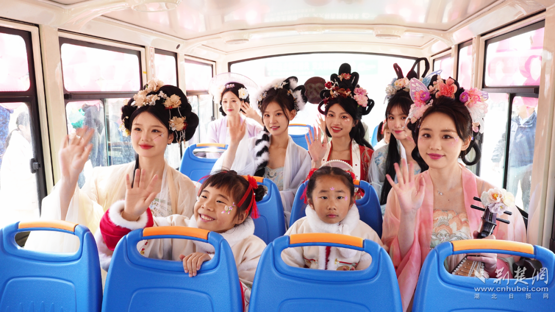 身著漢服的“桃花七仙女”乘坐花車,緩緩駛?cè)敕奂t如綺霞、潔白似瑞雪、深紅若烈火的桃花林中。她們蓮步輕移,手持桃花團(tuán)扇,或輕嗅桃花,或倚樹(shù)而立,顧盼生姿,舉手投足盡顯古典韻味,與前來(lái)賞花的游客熱情互動(dòng)。