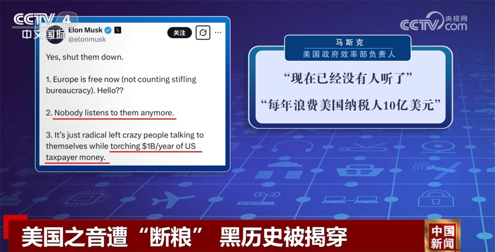 事實(shí)上,“美國(guó)之音”被噤聲早有跡象。2月9日,美國(guó)政府效率部負(fù)責(zé)人馬斯克在社交媒體平臺(tái)發(fā)文稱,美國(guó)之音電臺(tái)、自由歐洲電臺(tái)和自由廣播電臺(tái)等機(jī)構(gòu)“現(xiàn)在已經(jīng)沒人聽了”,它們“每年浪費(fèi)美國(guó)納稅人10億美元?!?/p>