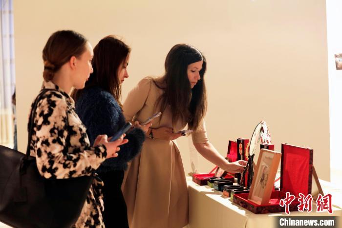 當(dāng)?shù)貢r(shí)間3月19日,“三湘四水 相約湖南”走進(jìn)俄羅斯文旅推廣活動(dòng)在莫斯科中國(guó)文化中心舉行。圖為俄羅斯觀眾參觀湘繡、湘茶、湘瓷等“湘字號(hào)”展覽。(中新網(wǎng)記者 田冰 攝)