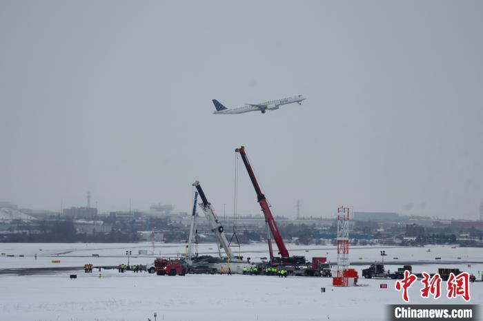 當?shù)貢r間2月17日,達美航空一架由美國明尼阿波利斯起飛的客機在多倫多皮爾遜國際機場著陸時發(fā)生事故。圖為2月19日,工作人員開始移除客機殘骸。 中新社記者 余瑞冬 攝
