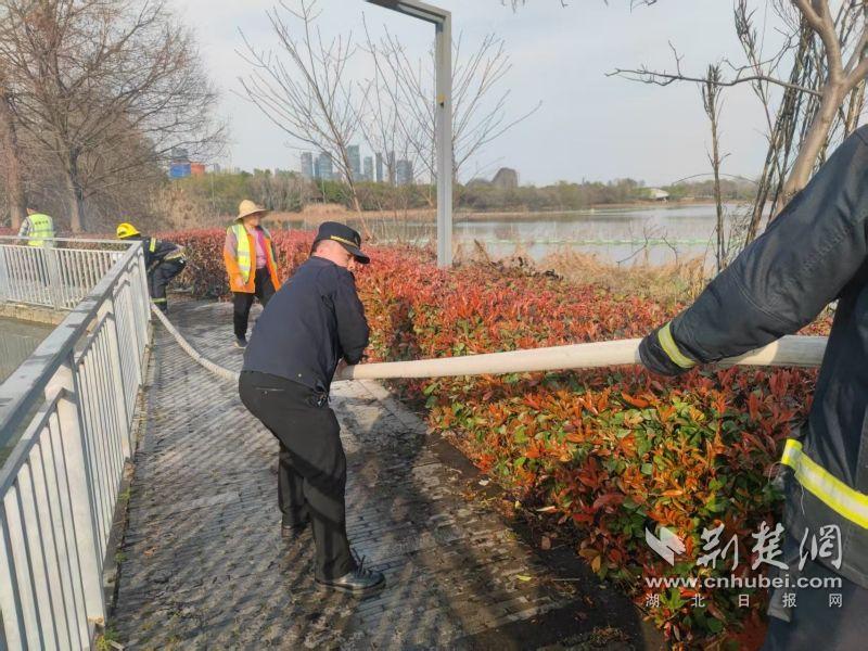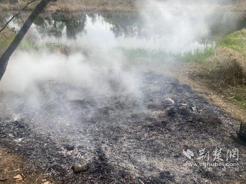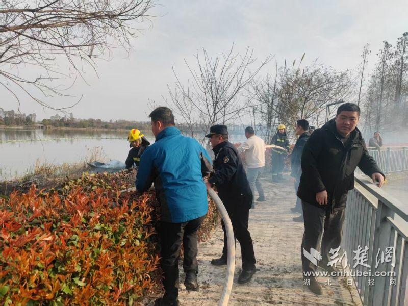 當(dāng)日下午,東湖風(fēng)景區(qū)城管執(zhí)法局四中隊(duì)隊(duì)員王建偉、宋威、劉鑫宇在九女墩附近巡查時(shí),發(fā)現(xiàn)華僑城運(yùn)動(dòng)中心南山草木集門(mén)店附近有濃煙升起。他們迅速趕到現(xiàn)場(chǎng),發(fā)現(xiàn)起火點(diǎn)為門(mén)店下方野塘中的蘆葦和干草,起火原因不明。由于野塘地勢(shì)復(fù)雜,無(wú)法直接取水滅火,現(xiàn)場(chǎng)情況較為緊急。