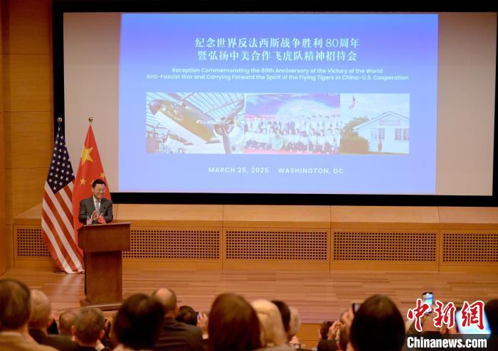 當?shù)貢r間3月25日,華盛頓,中國駐美大使館舉辦“紀念世界反法西斯戰(zhàn)爭勝利80周年暨弘揚中美合作飛虎隊精神”招待會。圖為中國駐美大使謝鋒致辭。中新社記者 陳孟統(tǒng) 攝