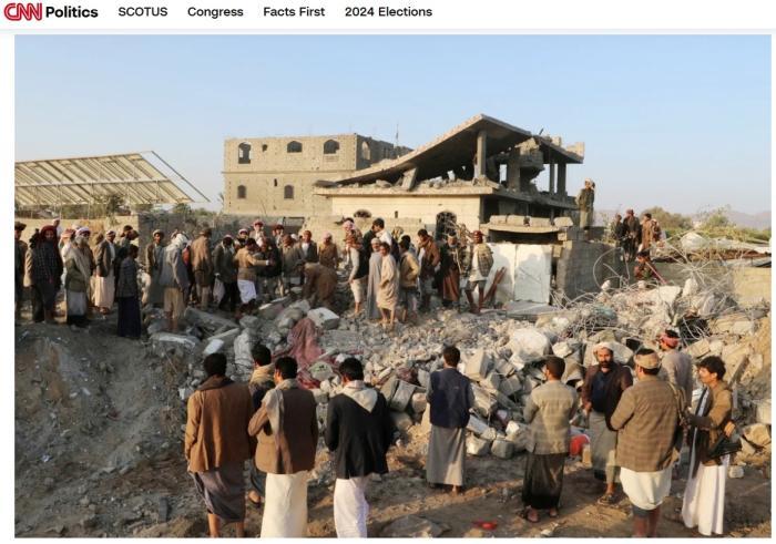 也門民眾聚集在一處空襲現(xiàn)場(chǎng)。圖/美國(guó)有線電視新聞網(wǎng)