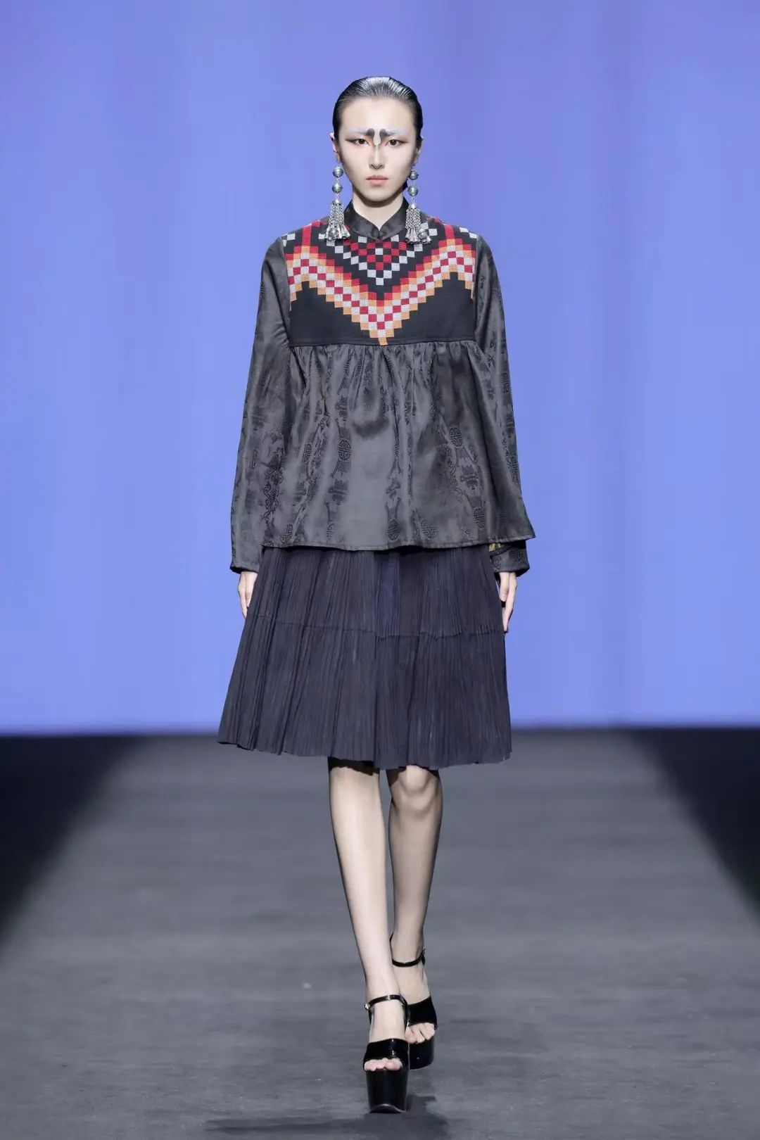 本次時裝周共展示了四大系列作品。其中,以西蘭卡普為核心元素的系列,憑借炫麗的色彩、精美的圖案和精湛的工藝,瞬間抓住眾人目光,為這場大秀注入了深厚文化內涵,毫無懸念地成為全場焦點。這一系列作品的廓形設計流暢自然,與西蘭卡普的傳統(tǒng)圖案相互映襯、相得益彰,碰撞出奇妙火花,打造出一系列服裝臻品。它們既散發(fā)著濃郁的傳統(tǒng)韻味,又巧妙融入現(xiàn)代時尚美學,在保留手工織錦原始質感的同時,充分考量當代人的審美理念,真正實現(xiàn)了傳統(tǒng)與現(xiàn)代的無縫對接與完美融合。