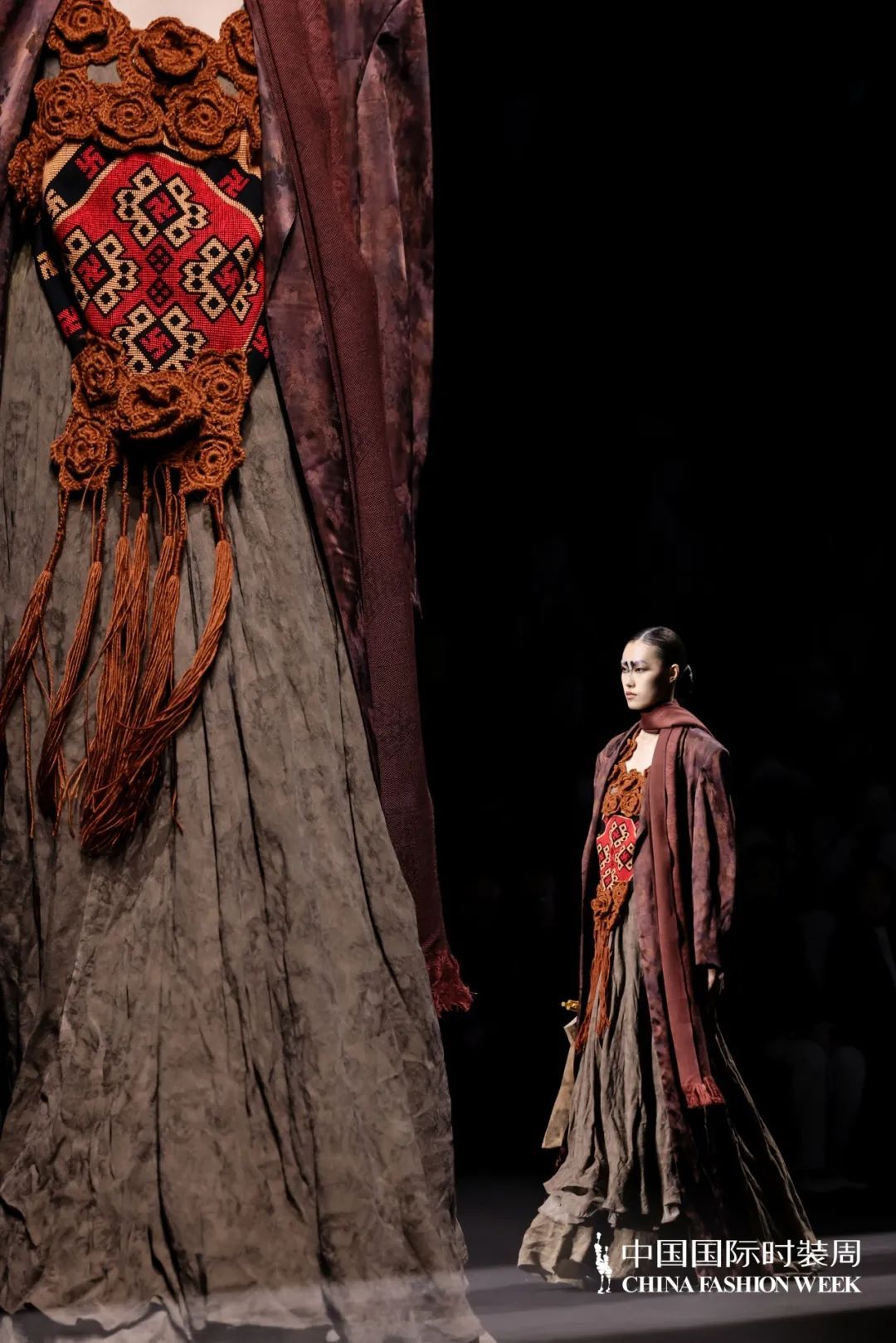 此次時裝周的核心設計團隊由中國十佳時裝設計師、中國紡織非遺推廣大使馮三三領銜。主創(chuàng)團隊從民間傳說中汲取靈感,巧妙地將西蘭卡普、香云紗、亮布等非物質文化遺產面料與陽新布貼、絨花、苗繡等傳統(tǒng)手工藝相結合,讓古老的藝術煥發(fā)新生。