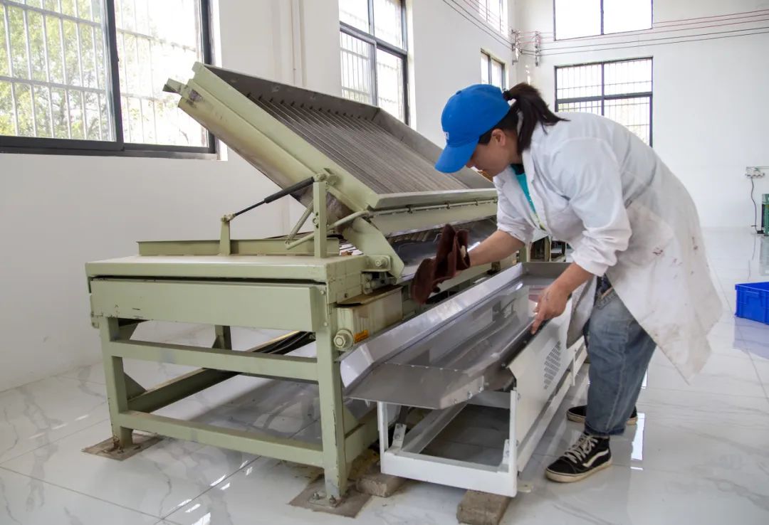 在距離木蘭湖20公里外的蔡家榨街道,綿陽山茶樹種植專業(yè)合作社內(nèi)千余平方米的制茶車間機(jī)械運轉(zhuǎn)轟鳴。自動生產(chǎn)線正將鮮葉轉(zhuǎn)化為精品茶,智能化監(jiān)測屏實時跳動殺青溫度和時間,身著白色工服的技師穿梭調(diào)試設(shè)備,茶青在傳送帶上翻滾、定型,濃郁的茶香的在空氣中彌漫。