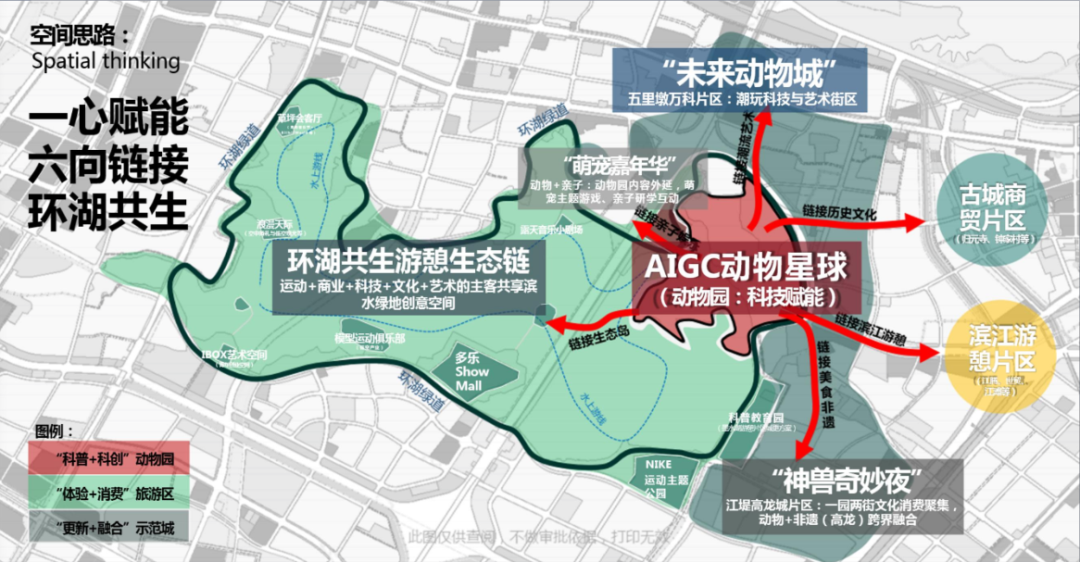 漢陽區(qū)文旅局發(fā)布環(huán)動物園文旅圈產(chǎn)業(yè)規(guī)劃,動物園片區(qū)擬圍繞“親子、運動、創(chuàng)意”三大主題詞,通過數(shù)游賦能、延鏈補空、引線搭橋,整合區(qū)域商文旅資源,打造“科普+科創(chuàng)”動物園、“體驗+消費”旅游區(qū)、“更新+融合”示范區(qū),形成“一心賦能、六向鏈接、環(huán)湖共生”的空間規(guī)劃思路。圍繞動物園提升打造AIGC動物星球,圍繞水路交通串聯(lián),豐富創(chuàng)意體驗空間,形成環(huán)湖共生游憩生態(tài)鏈。讓環(huán)動物園文旅圈形成“以文旅帶流量、以場景促產(chǎn)業(yè)”的引領(lǐng)效應(yīng)。
