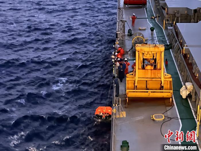 當(dāng)?shù)貢r間3月15日,在大西洋航行的“亞美麒麟”號貨船上,巴西漁船船員在中國船員幫助下登船。(黃永超 供圖)