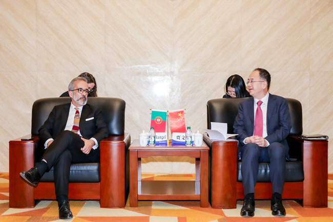 3月25日,葡萄牙國(guó)務(wù)部長(zhǎng)兼外交部長(zhǎng)保羅·蘭熱爾訪問(wèn)北京外國(guó)語(yǔ)大學(xué)。北外校長(zhǎng)、黨委副書記賈文鍵會(huì)見(jiàn)蘭熱爾一行。北京外國(guó)語(yǔ)大學(xué)供圖