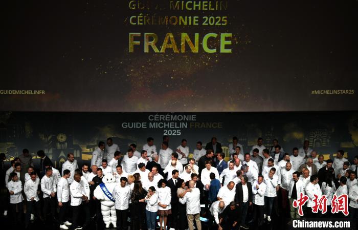 當(dāng)?shù)貢r(shí)間3月31日,2025年《米其林指南》法國(guó)版在法國(guó)東北部城市梅斯面世。2025年法國(guó)版指南新增68家星級(jí)餐館,這些餐館的廚師和經(jīng)營(yíng)者在當(dāng)天舉行的儀式上集體合影。中新社記者 李洋 攝