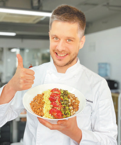 廣坦展示自己做的融合風(fēng)味小龍蝦拌面。周 琪攝